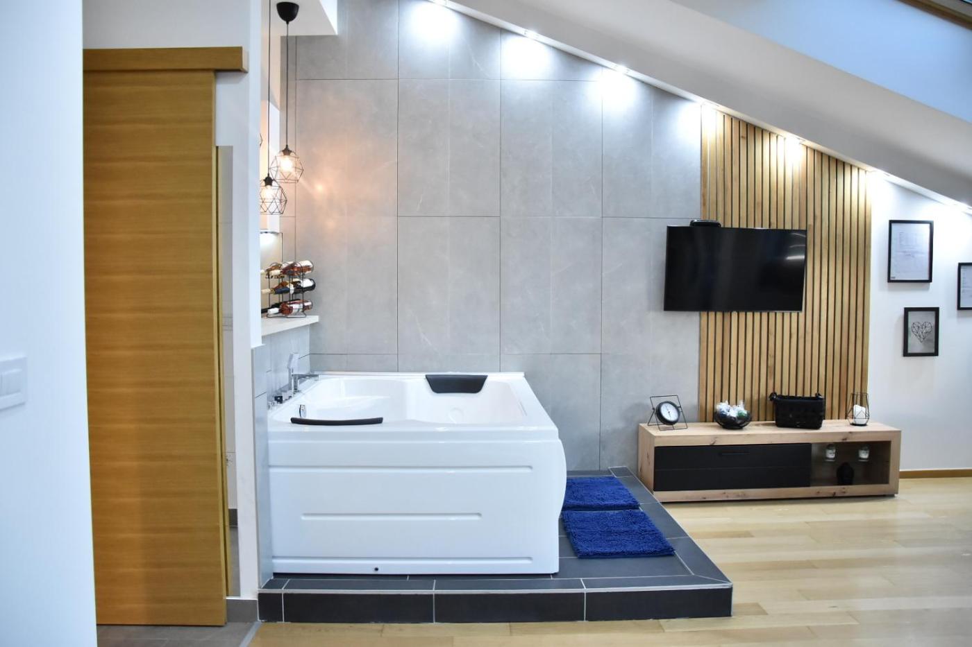 Apartment. The hot tub is a top feature of this apartment. The air-conditioned apartment has 1 bedroom and 1 bathroom with a bath and a shower. The fully equipped kitchen features a stovetop, a refrigerator, an oven and an electric kettle. Boasting a terrace with city views, this apartment also features soundproof walls and a flat-screen TV with cable channels. The unit has 1 bed. ;