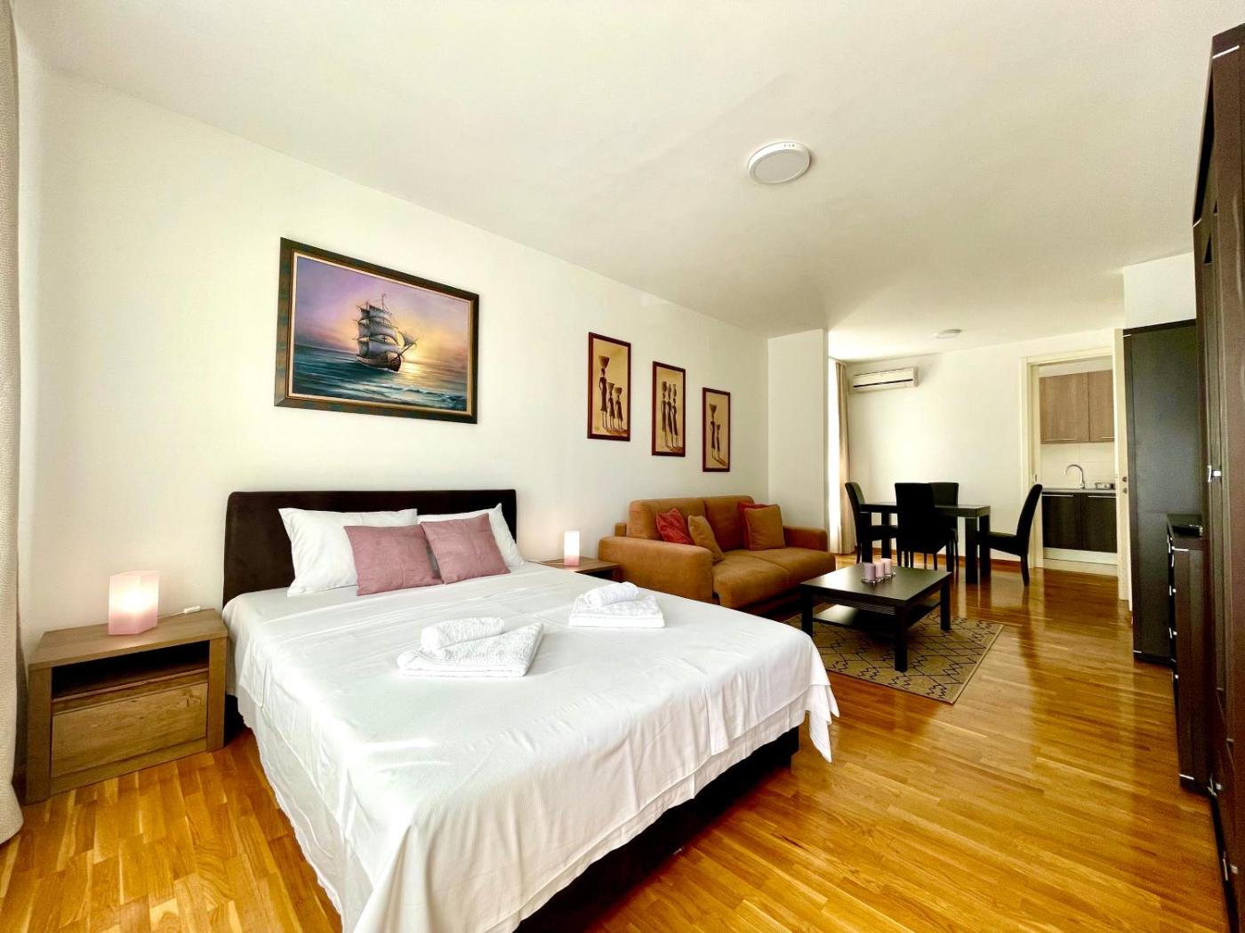 Studio Apartment. The air-conditioned apartment features 1 bedroom, 1 bathroom with a hairdryer and a kitchen. The apartments kitchen, which has a refrigerator, is available for cooking and storing food. Featuring a balcony, this apartment also offers a washing machine, heating and a flat-screen TV. The unit offers 1 bed.