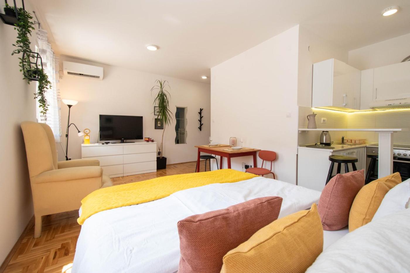One-Bedroom Apartment. Featuring a private entrance, this air-conditioned apartment is comprised of a kitchen, 1 bedroom and 1 bathroom with a shower and a hairdryer. In the kitchen, guests will find a stovetop, a refrigerator, kitchenware and an oven. The apartment features parquet floors, a seating area with a flat-screen TV, a washing machine, an electric kettle as well as ancourtyard view. The unit offers 1 bed.